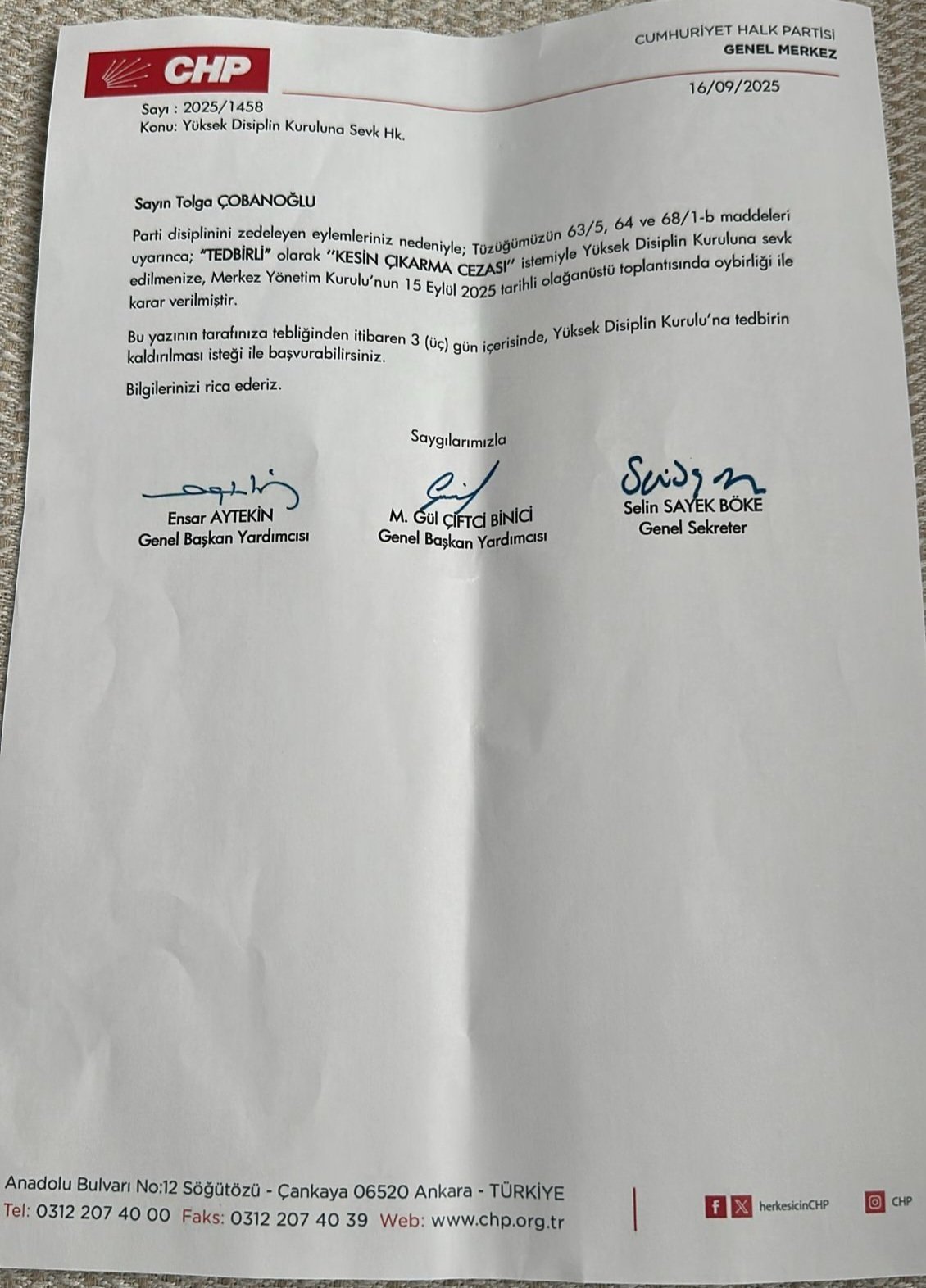 Çobanoğlu, parti disiplinini zedeleyen eylemleri nedeniyle, tedbirli olarak kesin çıkarma cezası istemiyle Yüksek Disiplin Kurulu’na sevk edildi.