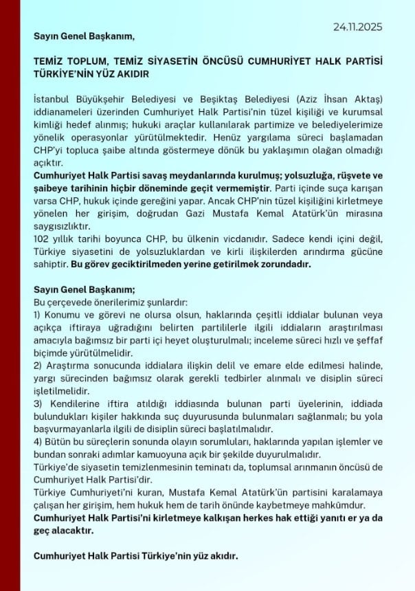 Bildiride, CHP’nin yalnızca kendi içinde değil, Türkiye siyasetinde de temizlenme ve arınmanın öncüsü olabilecek güce sahip olduğu kaydedilerek bu sorumluluğun ertelenmeden yerine getirilmesi gerektiği belirtildi.