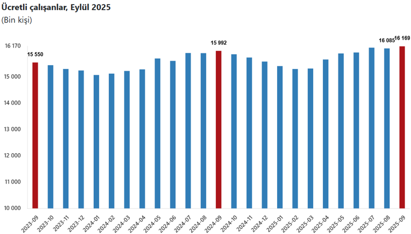 Türkiye İstatistik Kurumu (TÜİK) Eylül 2025’e ilişkin Ücretli Çalışan İstatistikleri’ni açıkladı. Buna göre ücretli çalışan sayısı bir önceki yılın aynı ayına göre yüzde 1,1 arttı. Ücretli çalışan sayısı bir önceki yılın aynı ayında 15 milyon 991 bin 589 kişi iken, 2025 yılı Eylül ayında 16 milyon 169 bin 476 kişi oldu.